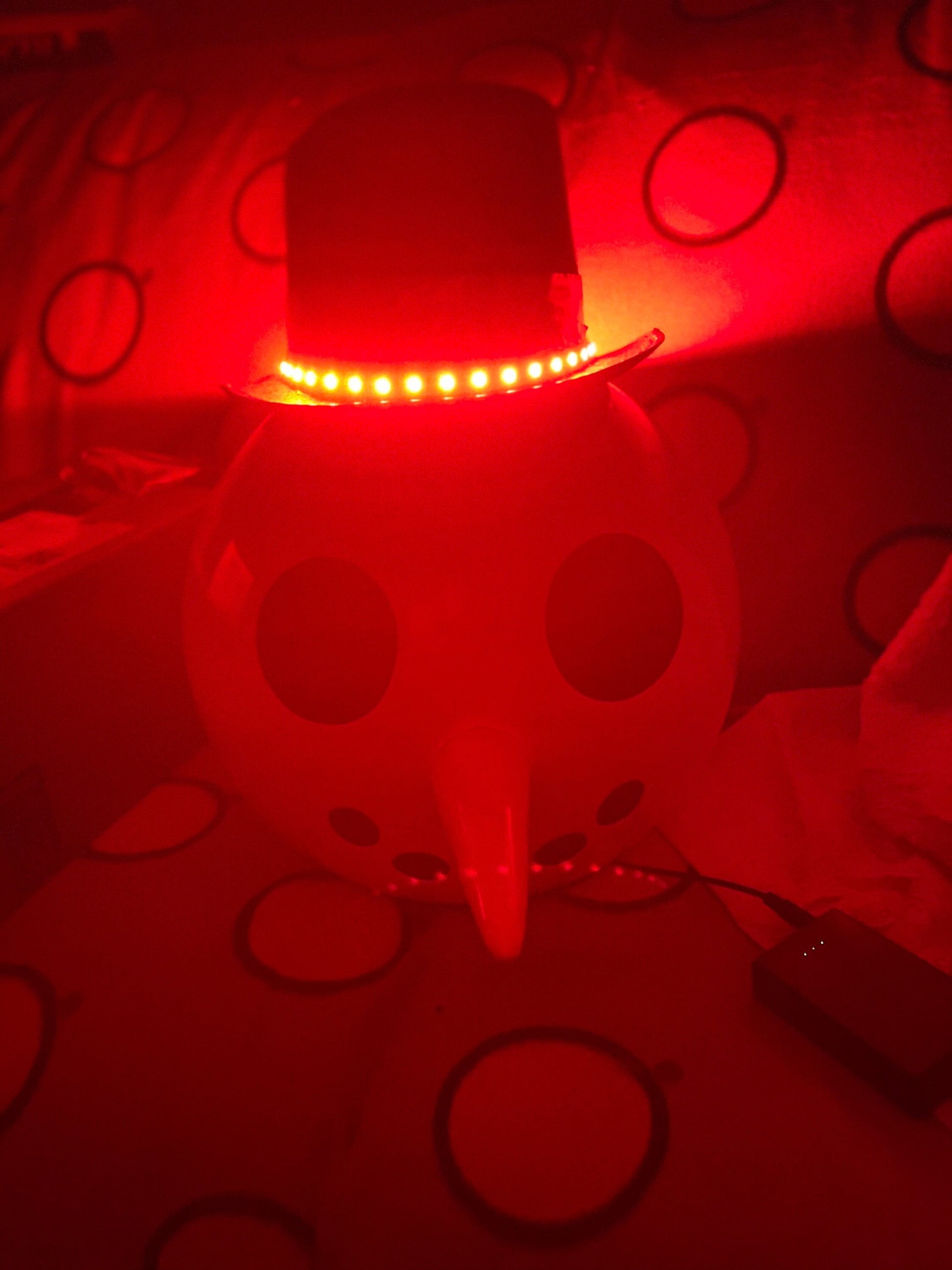 This is a 14 inch base snowman emoji helmet , with hand crafted nose painted orange . The helmet is painted white , and has a custom top hat with leds around the base on remote control with recharging battery pack , it’s fully adjustable for any one to wear ! Any questions hit me up here or on Instagram at RaveHelmetsinc